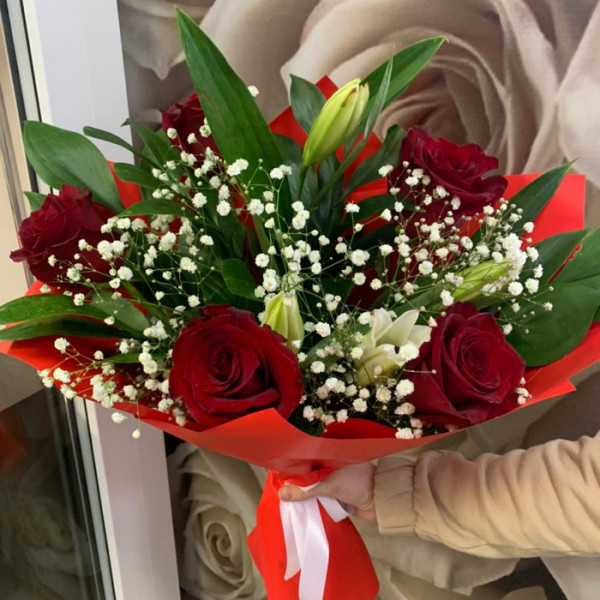 Розы красные - 5 шт, лилия белая - 1 шт, гипсофила - 2 шт (возможна заменана другую декоративную зелень), декоративная зелень, упаковка фетр
