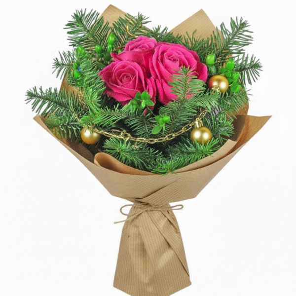 Небольшой букет из розовых роз и декоративных шишек будет отличным презентом на Новый Год. Такой подарок будет дарить радость в преддверие праздника, а елочные игрушки придадут сказочности этому букету.